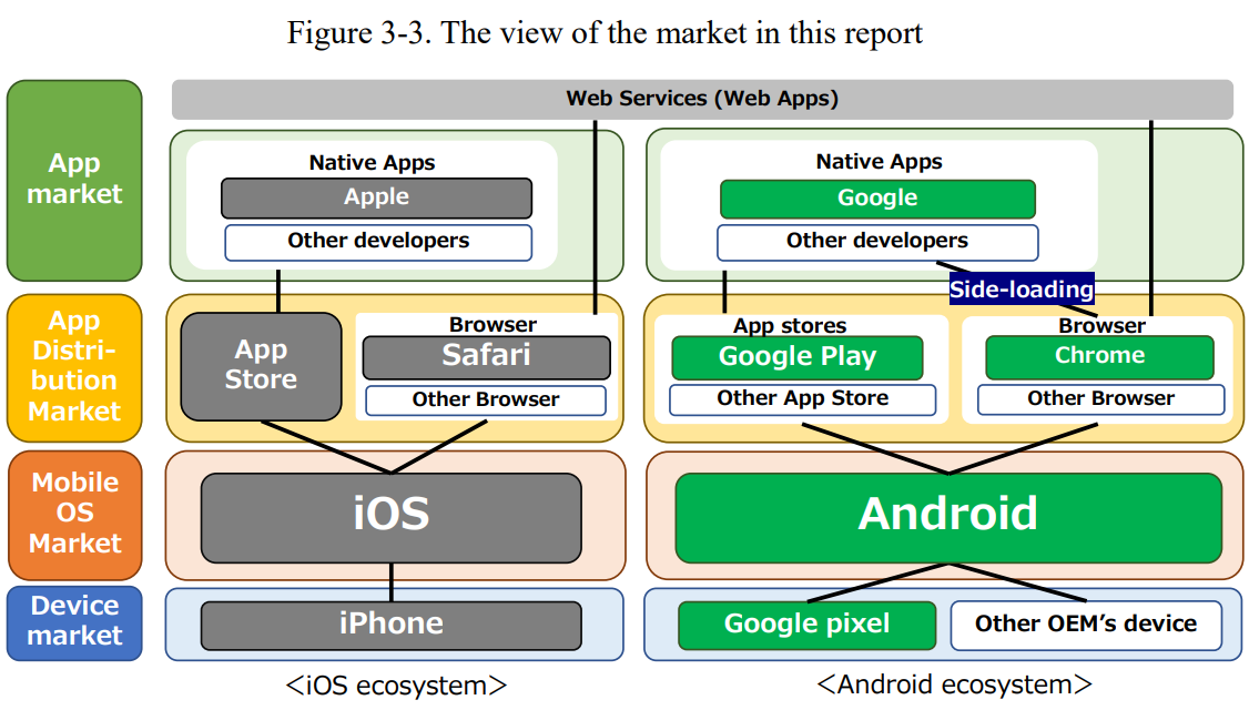 사실 지정과 관련해 법적으로 어떤 접근이 이뤄질지는 현실에서 크게 중요한 부분이 아닐 수 있다. 결국 스마트폰법이 타깃으로 하는 사업자는 애플(Apple)과 구글(Google)이니 말이다. 이는 일본 공정거래위원회의 2023년 모바일 OS 등에 관한 실태조사 보고서("モバイルOS等に関する実態調査報告書" 또는 "Market Study Report on Mobile OS and Mobile App Distribution")에 나오듯 법안 준비 과정부터 이미 공개적으로 알려지고 논의되어 온 부분이기도 하고(참고로 동 보고서에 따르면, 일본 모바일 OS 시장에서 2022년 기준 Android의 점유율은 53.4%, iOS의 점유율은 46.6%로 나타났다)*. 또 실제 최근 한 언론보도에서 일본 공정거래위원회가 '적어도 애플과 구글의 두 회사는 대상이 될 전망(少なくともAppleとGoogleの2社は対象になる見通し)'이라고 재차 확인해준 부분이기도 하다.