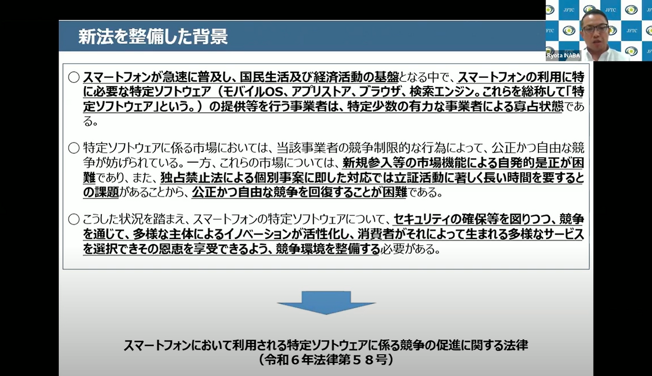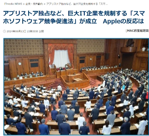 지난 6월 12일 일본에서는 국회 상원인 참의원(参議院) 의결로 새로운 플랫폼 규율이 법으로 도입되었다. 공식 명칭은 "스마트폰에서 이용되는 특정 소프트웨어와 관련된 경쟁의 촉진에 관한 법률(スマートフォンにおいて利用される特定ソフトウェアに係る競争の促進に関する法律)"로, 줄여서 "스마트폰소프트웨어경쟁촉진법(スマホソフトウェア競争促進法)" 또는 '스마트폰법'이라고도 한다. 현재 6월 19일 법률 제58호로 공포되어 내년 12월 19일 이전까지 전면 시행을 앞둔 상태다.