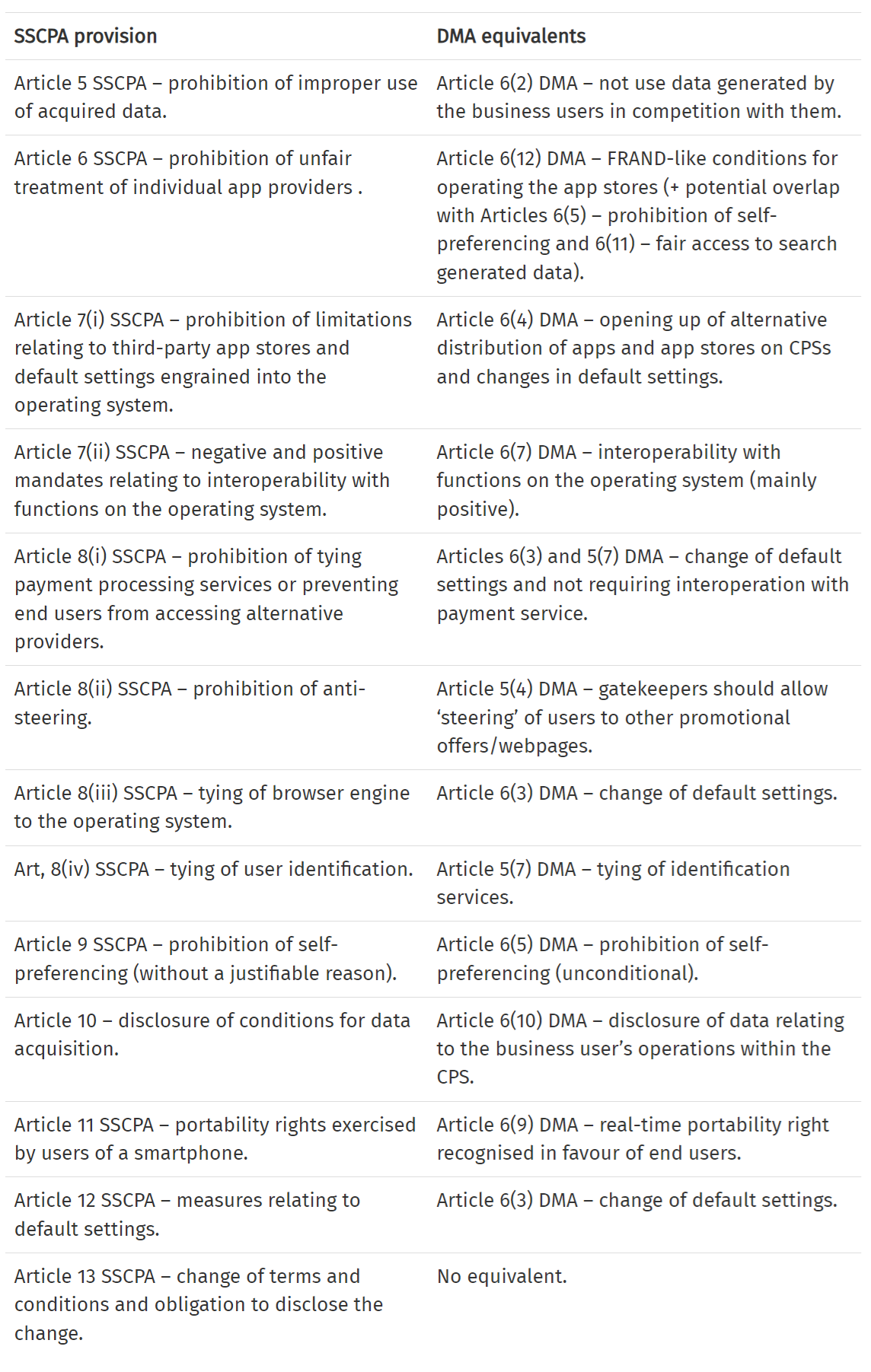 개략적인 규율 내용은 아래 표와 같다. 참고로 아래 표는 Alba Ribera Martínez와 내가 쓴 Kluwer 블로그 글에서 가져온 것으로 스마트폰법 의무 규정들의 규율 내용을 파악하기 위하여 EU DMA의 관련 규정들과 비교해 본 것인데, 규율 내용을 넘어 법적 성격이나 효과까지 비교한 것은 아니니 주의를 요한다.