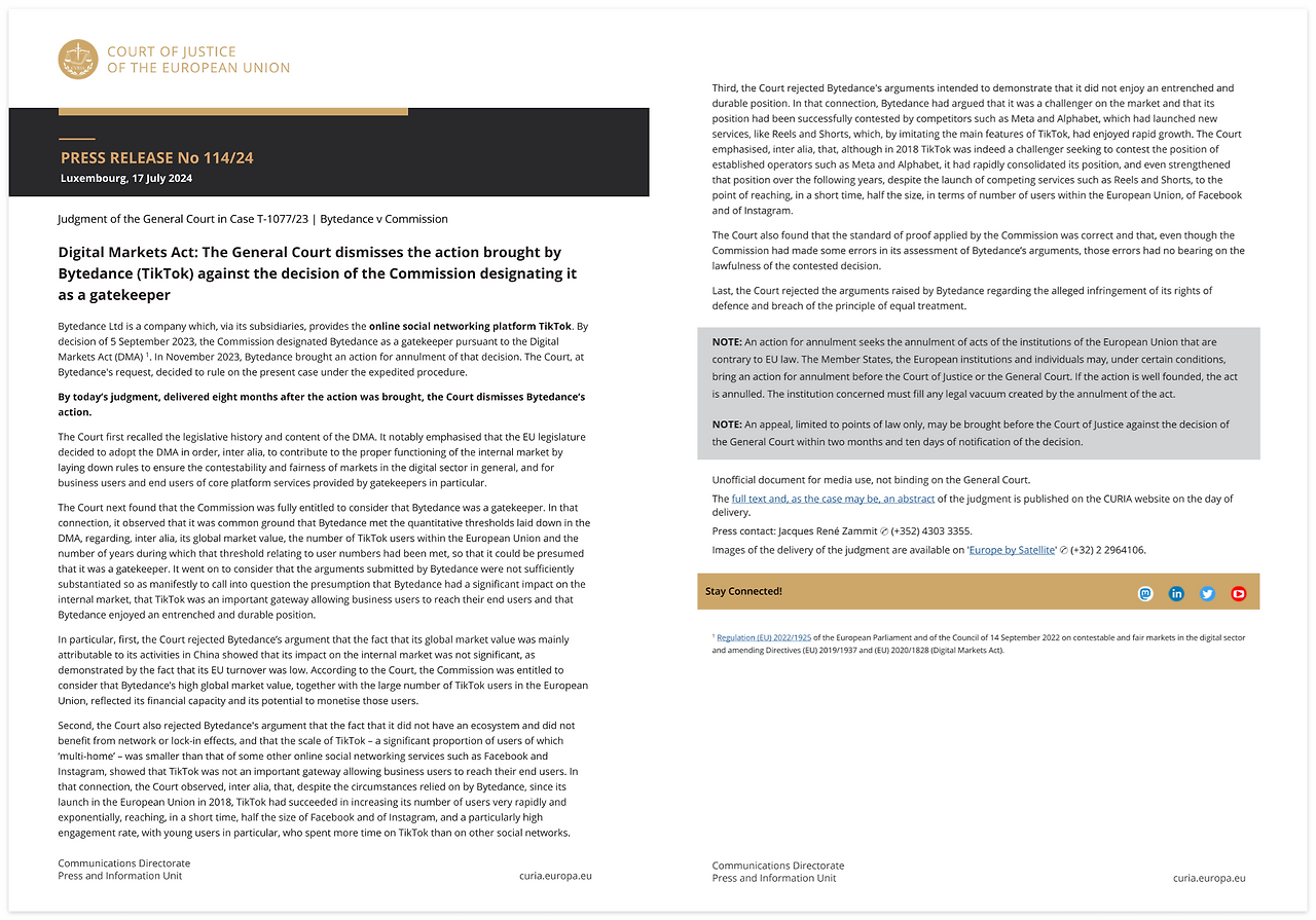 참고로, 최근 EU 일반법원(General Court)은 ByteDance 사건(T-1077/23)에서 집행위원회(European Commission)의 폭 넓은 재량을 존중하면서 DMA상 정량 기준을 충족하는 사업자의 게이트키퍼 지정(designation) 결정에 대한 불복 여지를 상당히 제약하는 판결을 내린 바 있다. 만약 이러한 선례가 앞으로 스마트폰법 해석에 있어서도 중요하게 참고된다면, 앞으로 일본에서도 당국이 정량 지표를 만족하는 특정 사업자에 대하여 지정 결정을 내린 것이 나중에 뒤집힐 가능성은 거의 없을 것으로 생각된다.