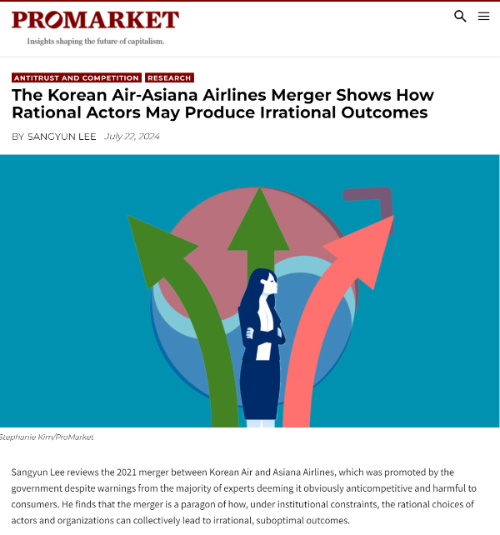 위 같은 연구 질문을 두고 작년 이맘 때쯤 지도교수님과 공저로 논문을 작성했었다. 제목은, '공공선택론의 시각에서 본 한국의 기업결합정책 — 대한항공⋅아시아나항공 사례.‘ 이후 한국과 일본에서 차례로 발표를 했고 지난 여름에는 미국에서 부탁을 받아 ProMarket에 기고도 했었다. 제목은 'The Korean Air-Asiana Airlines Merger Shows How Rational Actors May Produce Irrational Outcomes.’