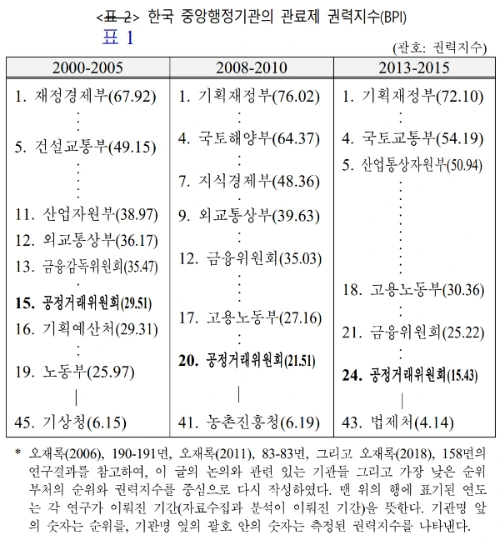 넷째, 구조적으로 공정거래위원회가 경쟁 정책에 충실한 판단을 내릴 수 없는 처지였다는 점도 생각할 필요가 있었다. 이 사건 빅딜 결정은 먼저 관계장관회의에서 내려진 뒤 공정거래위원회의 심사를 거치게 되었는데, 공정거래위원회의 독립성 문제는 별론으로 하더라도, 아래 표처럼 정부 내 권력 크기가 중위권 수준에 불과한 공정거래위원회가 관계장관회의에서 내려진 범 정부 차원의 결정을 뒤집기는 기대하기 어려운 상황이었다.
