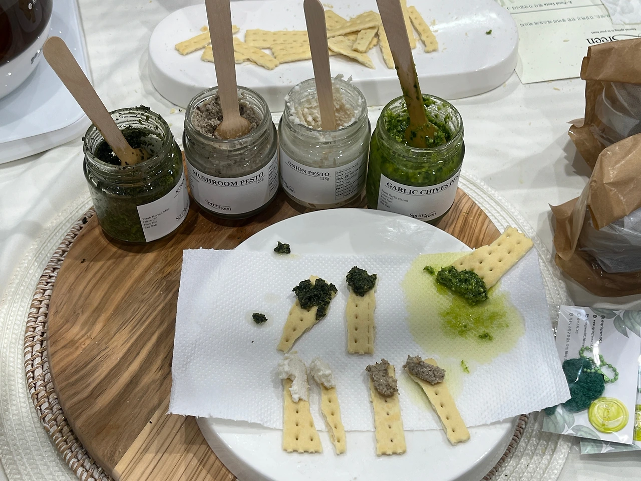 평소에 바질 페스토를 굉장히 좋아해서 즐겨 먹는데요, 이 자리에서 새로운 페스토를 소개해드리려고 합니다. 국내 대표 나물과 채소인 부추, 명이나물, 청양고추, 표고버섯 등으로 만든 페스토입니다. 재료 본연의 향을 살리면서도 과하지 않아서 부담없이 즐기기 좋았습니다. 이러한 창의적 접근은 글로벌 시장에서 한국 식품이 차별화할 수 있는 핵심 전략 중 하나라고 생각됩니다.