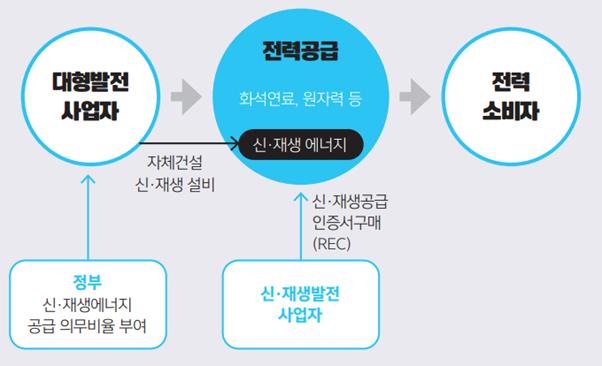 이 제도에 따라 대형발전사업자(공급의무자)는 직접 신재생에너지 발전설비를 건설하거나, 다른 신재생에너지 발전소의 공급인증서(REC)를 구매하여 신재생에너지 공급의무비율을 달성해야 합니다. 즉, 태양광 발전사업자는 공급의무자에게 신재생 전력을 REC 형태로 판매해 수익을 얻을 수 있습니다.