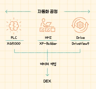 DEX에 의해 백업되는 엔지니어링 데이터란 구체적으로 무엇을 말하는 것일까요? 자동화 공정에는 다양한 기기들이 사용돼요. 자동화 공정의 두뇌라 할 수 있는 PLC(Programmable Logic Controller)와 공정을 제어하고 감시하는 역할을 하는 HMI(Human Machine Interface), 자동화 기기의 속도를 제어하는 Drive 등이 그것인데요. 엔지니어링 데이터란 바로 이러한 자동화 기기의 프로그래밍 도구에서 발생하는 데이터를 말해요. 쉽게 비유하자면 마이크로소프트의 엑셀, 워드, 파워포인트와 같은 프로그램 사용 시 저장되는 파일을 말하죠. DEX는 자동화 기기의 프로그래밍 도구인 XG5000, XP-Builder, DriveView9에서 발생하는 프로젝트 파일 정보를 백업하고 있어요.