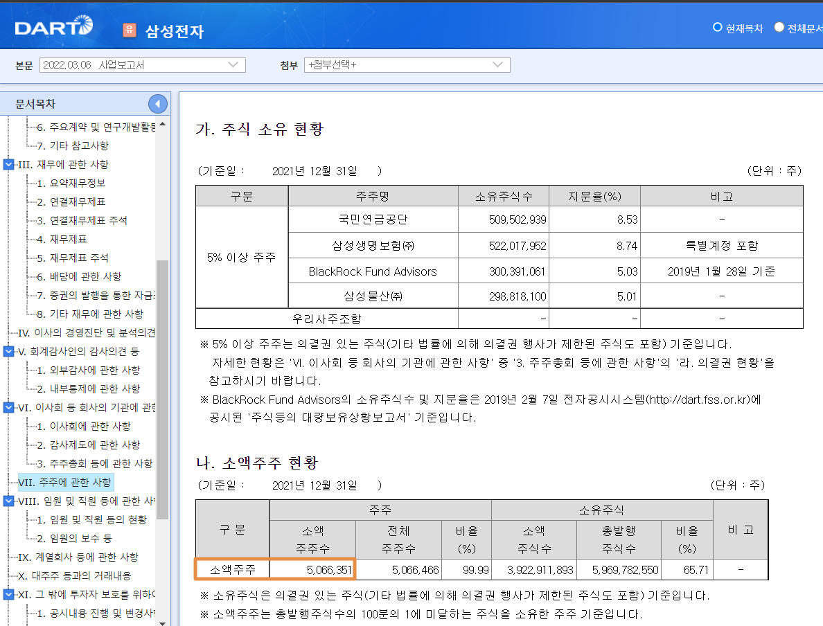 삼성전자에 투자한 소액주주 정보는 금융감독원 DART에 올려진 삼성전자 <사업보고서> ‘주주에 관한 사항’을 찾아보면 알 수 있습니다. 소액주주 현황에는 '개인들의 주식수'와 '소액주주 명수'가 나와 있습니다.