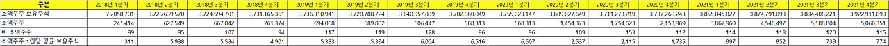 소액주주 명수와 소액주주 소유주식 수를 통해서 소액주주 1인당 평균 보유 주식 수도 구해보았습니다.