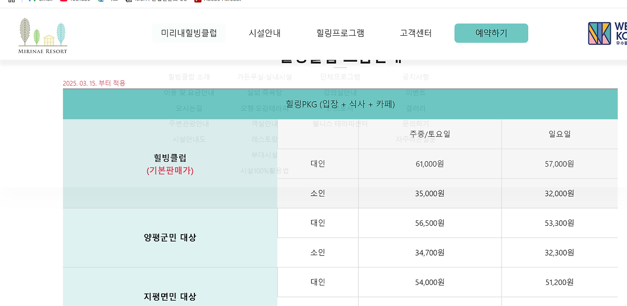 이 회사는 실제로 돈을 벌고 있는지, 손익분기점을 넘었는지, 재무적으로는 어떤 상태인지가 말입니다. 우선 입장료를 확인을 위해 홈페이지를 방문했습니다. 홈페이지에서 확인해 보니 미리내의 힐빙클럽 이용료가 성인 기준 주중과 토요일은 6만 1천 원, 일요일은 5만 7천 원이었습니다. 위치가 양평으로 상당히 멀어서 요금이 일요일은 낮게 책정된 것 같습니다.