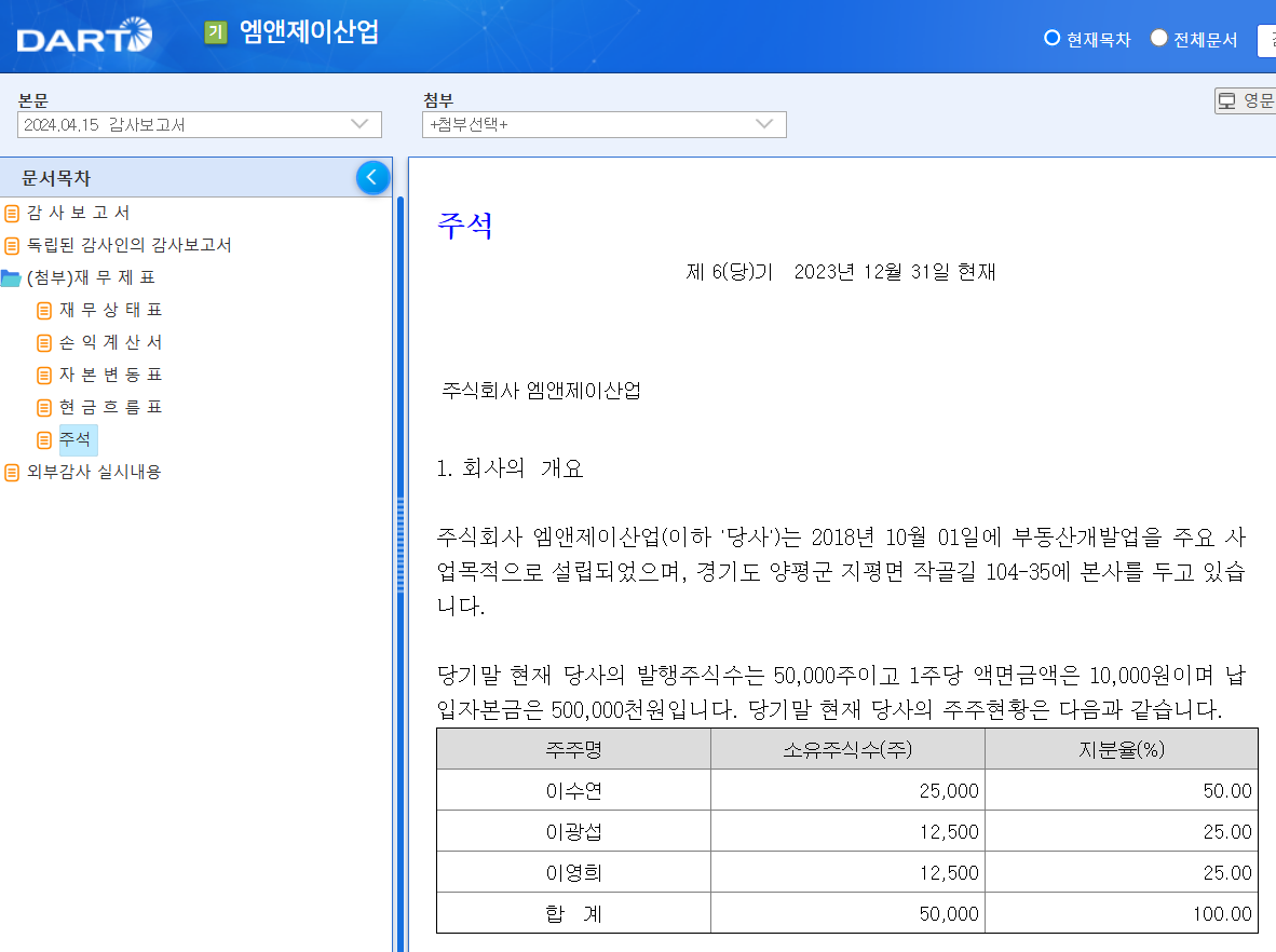 한편, 이 회사는 '엠앤제이산업'이라는 부동산 개발 업체를 관계회사로 두고 있습니다. 이 회사의 주요 주주 구성은 미리내와 중복됩니다. 특히 이광섭 대표이사와 이수연, 이영희 등 가족 구성원이 주요 주주로 등재되어 있습니다. 이 관계회사와의 차입금과 미지급금 거래가 미리내의 재무상황에 큰 영향을 미치고 있어 주의 깊은 관찰이 필요합니다.