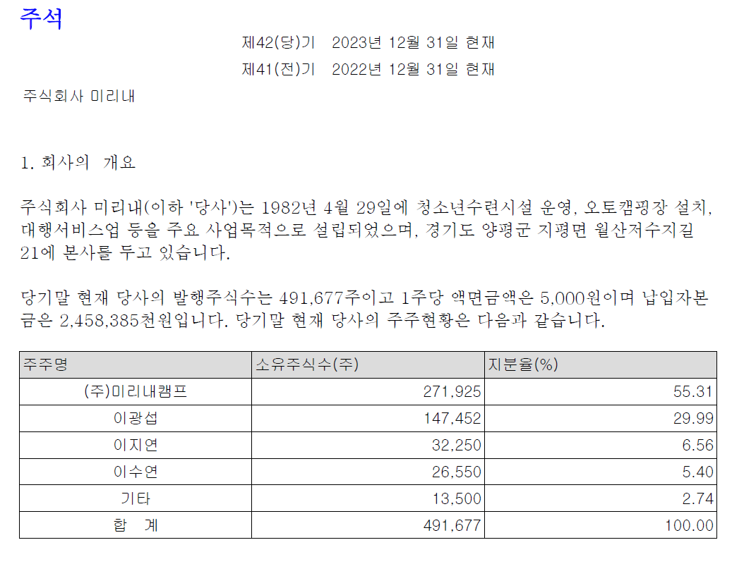 회사에 대해 조금 더 알아보니, 미리내는 1982년 4월 29일에 설립된, 상당히 오래된 회사였습니다. 주요 사업은 청소년 수련시설 운영과 오토 캠핑장 설치 등이었습니다. 경기도 양평군 지평면 월산저수지길 21에 본사를 두고 있으며, 미리내 캠프라는 회사가 지분 55.31%를 소유한 대주주입니다. 대표이사는 이광섭 씨로, 기타 가족들인 이지연, 이수연 씨가 주요 주주로 구성되어 있습니다.