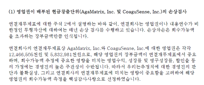 아이센스는 해외 종속기업 AgaMatrix, Inc. 와 CoaguSense, Inc. 에 대한 영업권은 각각 124억 원 및 58억 원을 재무제표에 기재하고 있습니다. AgaMatrix는 이미 손상 반영 완료, CoaguSense는 잠재적 위험 존재, 두 회사 모두 향후 실적과 시장 변수에 따라 영업권 가치 변동 가능성이 있으므로 주기적인 재평가가 중요합니다. 그냥 놔두면 매년 36억 원씩 비용처리가 발생합니다.(이는 회계적 수치이지만 당기순이익을 낮추는 효과가 발생합니다)