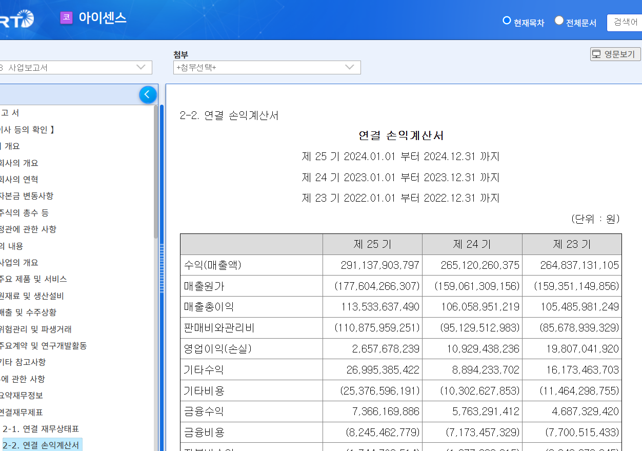 2024년 실적 분석 (연결 기준): 아이센스의 2024년 연결 매출액은 2023년 대비 9.8% 성장한 2,911억 원**을 달성했습니다. 그러나 영업이익은 2023년 10,929백만 원 대비 75.7% 감소한 2,658백만 원을 기록했으며, 당기순이익은 손실을 기록했습니다. 영업이익 감소의 주요 원인으로는 차세대 제품인 연속혈당측정기(CGMS)에 대한 연구개발비용 및 임상 진행 비용, 양산품 출시 관련 비용 증가, 그리고 신규 자회사 편입 및 해외 종속법인의 실적 악화 등이 언급되었습니다.