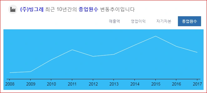 어찌하였거나 꾸준한 영업이익이 적립금의 원천입니다. 최근 4년간 빙그레의 ⑤영업이익은 317 → 372 → 347 → 394 순으로 300억 원 후반 대를 유지하고 있습니다. 지난해 조금 좋았는데요. 무더워가 한 몫을 했다고 생각합니다. 빙그레의 주가를 보면 2015년 기점으로 안정화를 찾는 걸 볼 수 있습니다. 과거 영업이익을 보니 2015년 전에는 더 좋았습니다. 600억 원을 기록할 때도 있었습니다. 시장확장을 위해서 약간 강하게 드라이브를 걸었던 시기가 2015년 전후가 아닐까 추정해 봅니다. 종업원수 10년치 변동추이를 보면서 드는 생각입니다.