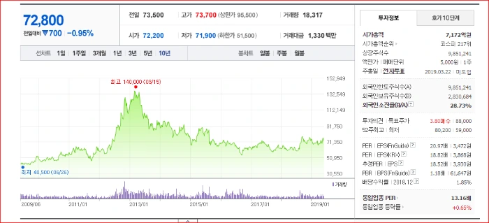 50년을 훌쩍 넘긴 회사답게 안정적인 재무구조를 갖고 있습니다.① FY2018년 기준 자산총계 6,539억 원이며, 매출액은 8,551억 원입니다. 중요한 포인트는 지난 4년간 거의 변화가 없다는 것입니다. 요즘처럼 경기가 안 좋네, 경제가 엉망이네 말들이 많지만 빙그레는 영향을 받지 않습니다. ②매우 낮은 부채비율(20%)도 걱정거리를 더는 요소입니다.