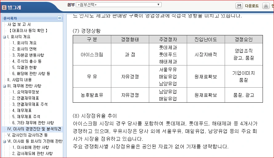 빙그레가 국내 보다는 오히려 해외에 눈길을 두는 것도 투자효용이 높다고 생각한 것이 아닌지 짐작해 봅니다. 아시다시피 우리가 좋아하는 음식(식품)을 외국인들이 좋아할지는 알 수 없는 모험입니다.(사 먹는 그들조차 모험이죠.) 허나 경쟁상황이 오래도록 굳혀진, 유제품∙빙과제과 시장에서 빙그레가 안주하지 않기를 바랍니다.