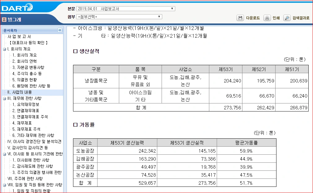 곧 여름이 다가옵니다. 벌써부터 더운데요. 빙그레 주요 제품은 냉장 유제품과 빙과입니다. 이걸 만드는 공장이 도농, 김해, 광주, 논산 4군데 있습니다. 평균 공장 가동률이 51.7%라는데 2018년 기준 임직원 수는 1,514명입니다. 여름이 되면 그래도 바빠질 것 같은데 계절적 요인 말고도 매출이 많이 늘어서 직원들 많이 뽑고, 월급 많이 줬으면 좋겠습니다.