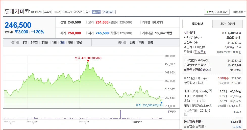 롯데케미칼, 최근 3년간 주가를 보니 2018.3.2 475,000원이었던 주가가 지금은 246,500원입니다. -50% 하락 정말로 1년 반만에 반토막이 난 셈입니다. 그사이 롯데케미칼에게 무슨 일이 있었던 걸까요? 국제유가 하락, 지배구조 이슈 등 언뜻 떠오르는 게 있지만 재무제표 숫자로만 살펴보고자 합니다.