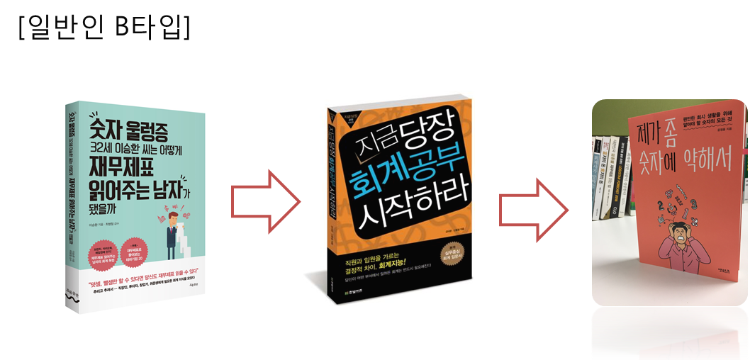 [일반인 B타입]은 직장을 다니면서, 회계팀에서 뭐라 자꾸 그러는데, 즉 회계개념이 부족해 직장생활이 곤란한 분들을 위한 코스입니다. 직장인의 회계싫어증이 도지기 전에 보시면 좋은 책입니다. 직장인이 교양으로 회계를 배운다면.... 이 코스를 추천합니다.