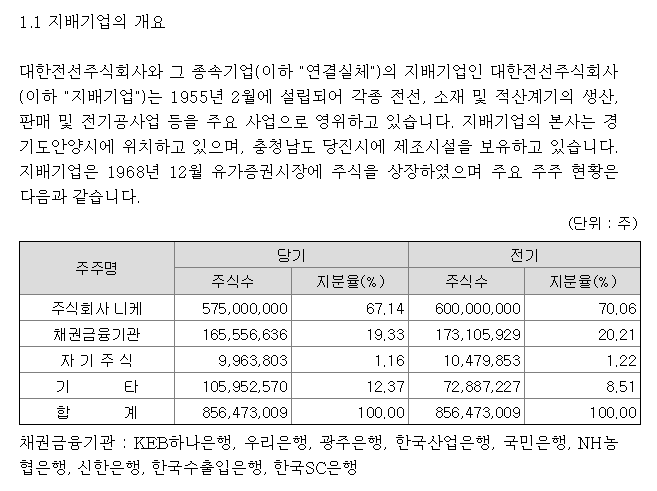 대한전선은 2015년 ‘계속기업가정’ 의심으로 강조사항이 달렸던 기업입니다. 이후 2015년 9월 사모펀드 IMM PE에게 인수됩니다. 현재 대주주는 67.14% 지분을 가진 주식회사 니케입니다.