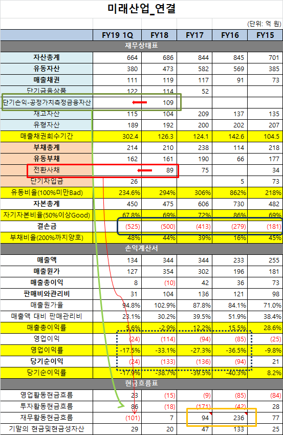 FY2019 1분기 기준 자산 664억 원. 부채비율 48%입니다. 그사이 2015~2018년도 여전히 영업이익 적자입니다. 다만 현금흐름이 나쁘지 않고 부채비율이 좋은 이유는 2016년의 유상증자, 2017년 전환사채 발행이 성공했기 때문입니다.