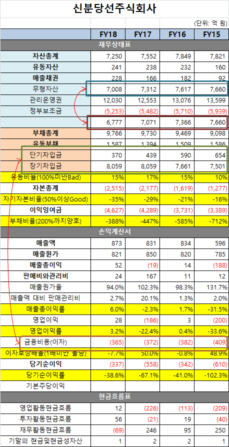 신분당주식회사 최근 기사를 찾아보니 ‘정시성’(제 때에 도착하는) 평가 점수에 관한 기사가 검색됩니다. 그런데 재무제표를 보면, 이거 곧 멈추는 거 아냐? 라는 생각이 들 정도입니다. 감사보고서 상으로 적정이지만 ‘강조사항’에는 계속기업존속능력 의심이라는 문구가 들어 있습니다. 영업손실이 -218억 원이고, 완전자본잠식 상태입니다. 신분당선은 2011년 개통되어, 저 역시 매일 아침마다 잘 타고 다니는 지하철입니다. 간략한 재무정보를 살펴보면 2014년 기준 자산 8,097억 원 / 부채 8,764억 원 / 자본 -667억 원입니다. 매출액 560억 원이나 매출원가가 768억 원이니 기본적으로 영업손실이 나는 구조입니다.