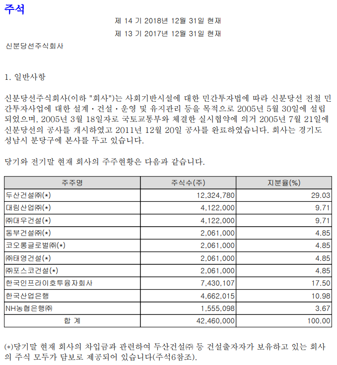 주주 현황은 건설사와 한국산업은행인데 두산건설㈜가 가장 많은 지분을 갖고 있습니다. 주주현황 아래 주석이 달려 있는데 건설출자자가 보유하고 있는 회사 주식은 모두 담보로 제공되어 있다고 합니다. 차입금(장∙단 합계)이 8,400억 원 정도네요.