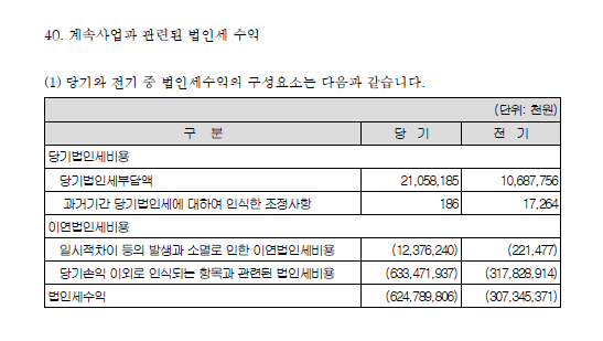 지난해 손익을 살펴보면 2018년 매출액 6조 3,268억 원의 영업적자 -339억 원, 당기순이익 2,892억 원을 기록합니다. 영업손실을 냈는데 당기순이익이 흑자인 이유는 기타이익 +2,141억 원, 금융원가 -4,529억 원 등의 영업 외 손익이 영향을 주기도 했지만 가장 큰 이유는 법인세수익 +6,247억 원 때문입니다. 당기순이익 전 법인세차감순손실이 -3,355억 원이었는데 세금 관련은 재무회계와 세무회계 사이의 조정항목인 이연법인세가 영향을 줍니다. 이번에는 꽤나 금액이 크네요. 실제로 어떤 내용인지는 재무제표 상으로는 구체적으로 알 순 없습니다. 2018년의 특이사항입니다.