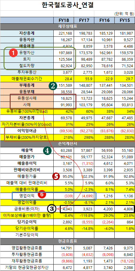 전국에 깔려 있는 선로와 역사 그리고 철도열차를 생각해 봅니다. 그게 다 얼마일까요? 한국철도공사의 FY18 연결 재무제표 기준 자산총계는 22조 1,168억 원입니다. 부채비율 218% 자본 결손금이 -8조 9,536억 원입니다. 바로 눈에 띄는 결손금. 우와! 철도는 기간산업입니다. 물류와 사람들을 나르기 위해서 선로와 역사를 짓습니다. 아직 사람들이 잘 가지 않는 곳도 인프라 구축을 위해서 철도를 놓습니다. 만약 이런 공공성을 가진 기업이 흑자가 난다는 건 국민들에게 더 많은 요금을 받아야 합니다. 초기 투자비용이 ‘어마 어마’ 할 수도 있습니다. 8조 원의 결손금은 이런 차원에서 이해해야 합니다.