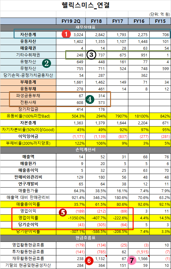 ⑥ 현금흐름표를 보면 투자 관련 사항이 좀더 구체적으로 알 수 있습니다. 2016년 유상증자 1,528억 원과 ⑦전환사채 1,031억 원이 재무활동으로 기업에 유입되었습니다. 자금이 풍부해 신약 개발뿐만 아니라 당기손익-공정가치금융자산에도 투자를 하고 있습니다. 2018년 금융자산 대략의 합계가 682억 원이며, 이를 통해서 금융수익(파생상품평가 이익) 248억 원이 생겼습니다. 덕분에 2019년 반기손실을 -43억 원으로 줄 수 있었습니다. 최근 적자가 무척 많이 났음에도 불구하고 기말의 현금은 364억 원(2018년), 284억 원(2019년 반기) 넉넉합니다.