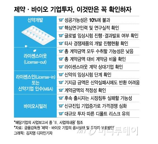 제약∙바이오 산업이 우리 경제의 신성장 산업으로 주목 받으며, 개인 투자자들의 관심이 급증했습니다만 기존 제약산업과 달리 신약개발은 몇 가지 위험요소가 잠재합니다. 2018년 금융감독원에서는 이를 알리기 위해 [제약∙바이오 기업 투자자 유의사항]을 배포하기도 했습니다. 금감원이 왜 그랬을까요? 과열된 투자열기! 그 위험성을 그나마 객관적으로 알리려고 한 게 아닐까요?