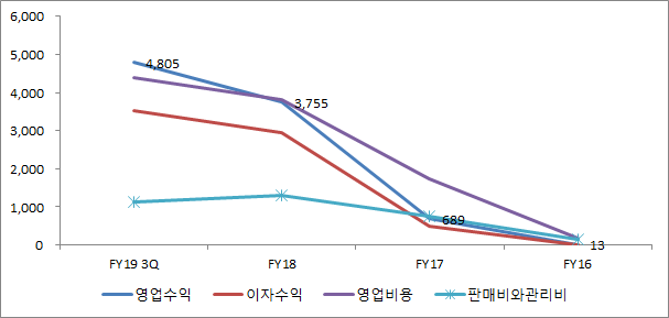참고로 국민은행의 2018년 영업이익이 4.2조 원이고, 지점이 1,100개가 넘습니다. 자산 덩치가 비슷한 저축은행과 비교해도 카카오뱅크는 여러 모로 아직까지는 작은 은행입니다. SBI저축은행의 2018년 영업수익은 7,356억 원, 이자수익이 6,302억 원입니다. SBI저축은행도 수수료수익은 손해입니다. 그러나 이자로만 순이익이 4,899억 원입니다. 예대마진이라고 불리는 수익구조가 여전히 우리나라 은행의 주수입원입니다. 2.9%의 영업이익률을 높이기 위해서는 카카오뱅크도 기본적으로는 '이자수익'의 규모를 늘려야 합니다. 즉 대출규모가 늘어야 합니다.