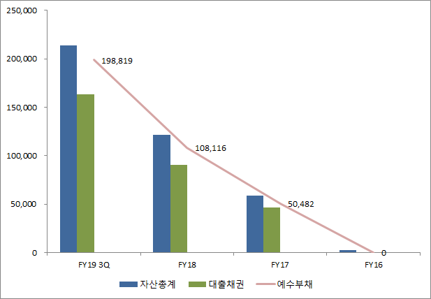 2019년 3분기 기준 카카오 자산총계는 21조 3,875억 원으로 2018년 말보다 9개월만에 76% 커졌습니다. 고객들이 예금한 돈을 나타내는 예수부채 19조 8,819억 원으로 84% 증가, 수신과 마찬가지로 여신(빌려주는 돈) 대출채권 16조 3,655억 원 80% 늘었습니다.