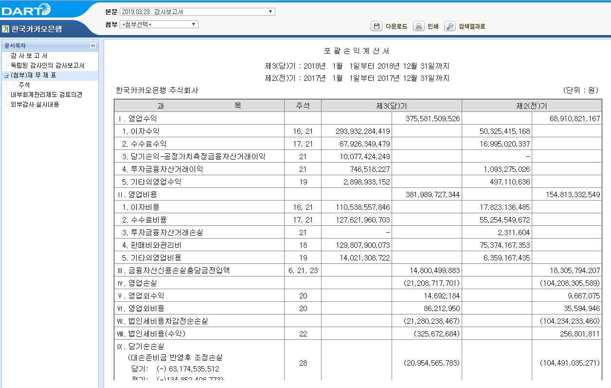 규모가 늘어난 것에 비해서 영업수익은 3,755억 원 → 4,805억 원으로 28% 증가했을 뿐입니다. 또 흑자로 전환했다고 하지만 아직은 이익이 작습니다. 이자수익과 수수료수익이 미미합니다. 대출채권을 통해 난 이자로는 이익을 내고 있지만, 카드관련업무지급수수료, CD/ATM지급수수료 등 수수료 쪽은 마이너스입니다. 지점이 없는 게 인터넷은행의 장점이지만, 기존 은행과 동일한 서비스를 제공하기 위해서는 비용을 지출해야 합니다.