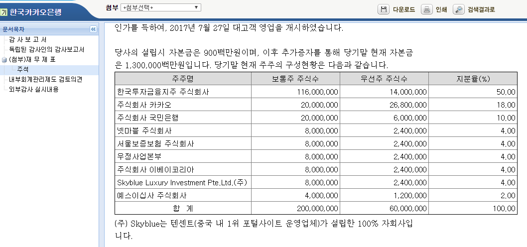 얼마 전에 지배구조 즉 1대 주주가 바뀌었습니다. 2019.11.29 ㈜카카오는 콜옵션 행사에 따라서 한국투자금융이 보유하고 있던 주식을 취득해 한국카카오은행의 대주주가 되었습니다. 이제 정말로 카카오의 ‘뱅크’가 되었습니다. 2018년 재무제표 기준으로 한국카카오은행에는 국민은행, 넷마블, 서울보증보험, 우정사업본부, 이베이코리아, Skyblue Luxury Investment Pte.Ltd., 예스이십사가 주주로 구성되어 있습니다. Skyblue는 텐센트 자회사입니다. 주주구성이 사업 파트너 리스트가 되어도 나쁘지 않겠다는 생각이 듭니다. 카카오뱅크의 사업적인 확장성이 기대되는 조합입니다. 은행, 게임, 보험, 우편, 국제유통, 도서, 중국 등 다 연결시키면 뭔가 될 거 같지 않나요?
