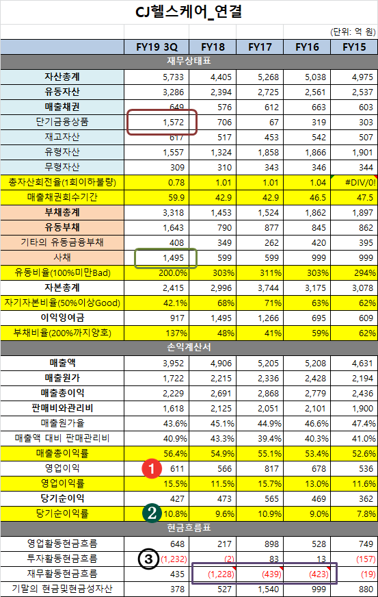 지난번 글 https://brunch.co.kr/@lshkorea/80 때 살펴 본 CJ헬스케어의 최상위 회사 한국콜마의 과제는 1.2조 원에 달하는 차입금(부채비율 185%) 해결입니다. 그래서 헬스케어의 상장이 필요합니다. 2018년 4월 인수거래를 마쳤고, 불과 2년이 아직 안되었지만, 나아진 성과를 보여줘야 합니다. 그러므로 2019년 결산을 마친 헬스케어의 재무제표가 중요한 이유입니다.