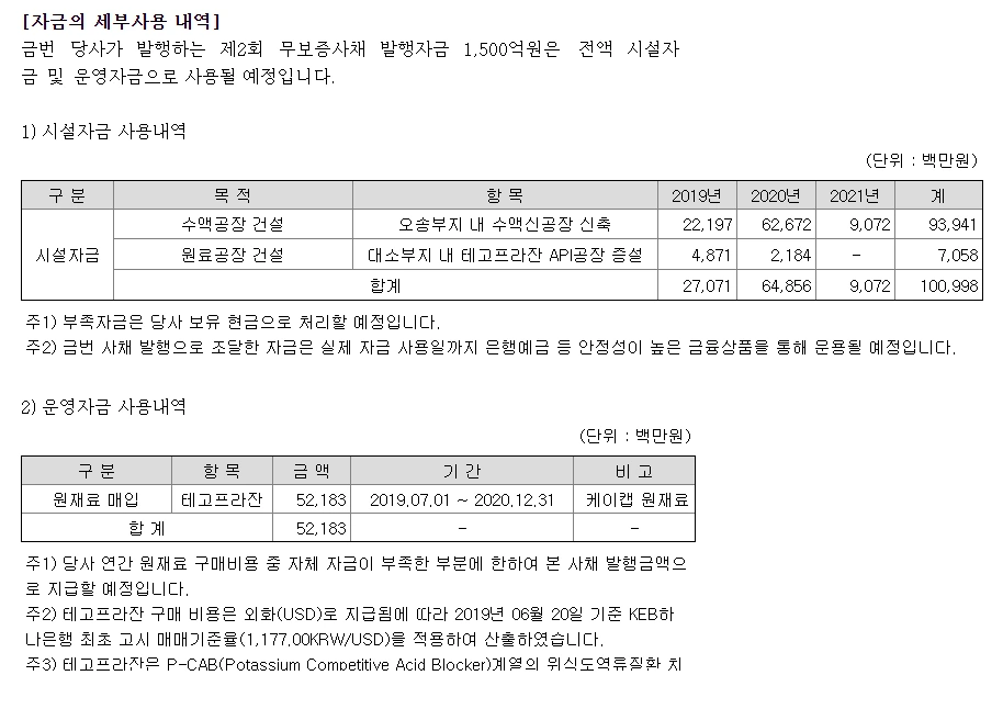 2019년 3분기까지 CJ헬스케어 자산총계는 5,733억 원으로 인수 후 조금 늘었습니다. 다만, 단기금융상품이 706 → 1,572억 원으로 증가한 것 외에는 아직까지는 큰 변화는 안 보입니다. 그런데 부채비율이 137%로 증가했습니다. 원인은 사채가 1,495억 원으로 증가했습니다. 공시 상으로 1,500억 원의 사채가 발행되었으며 이는 수액 및 원료 공장신설 자금으로 사용된다고 합니다.