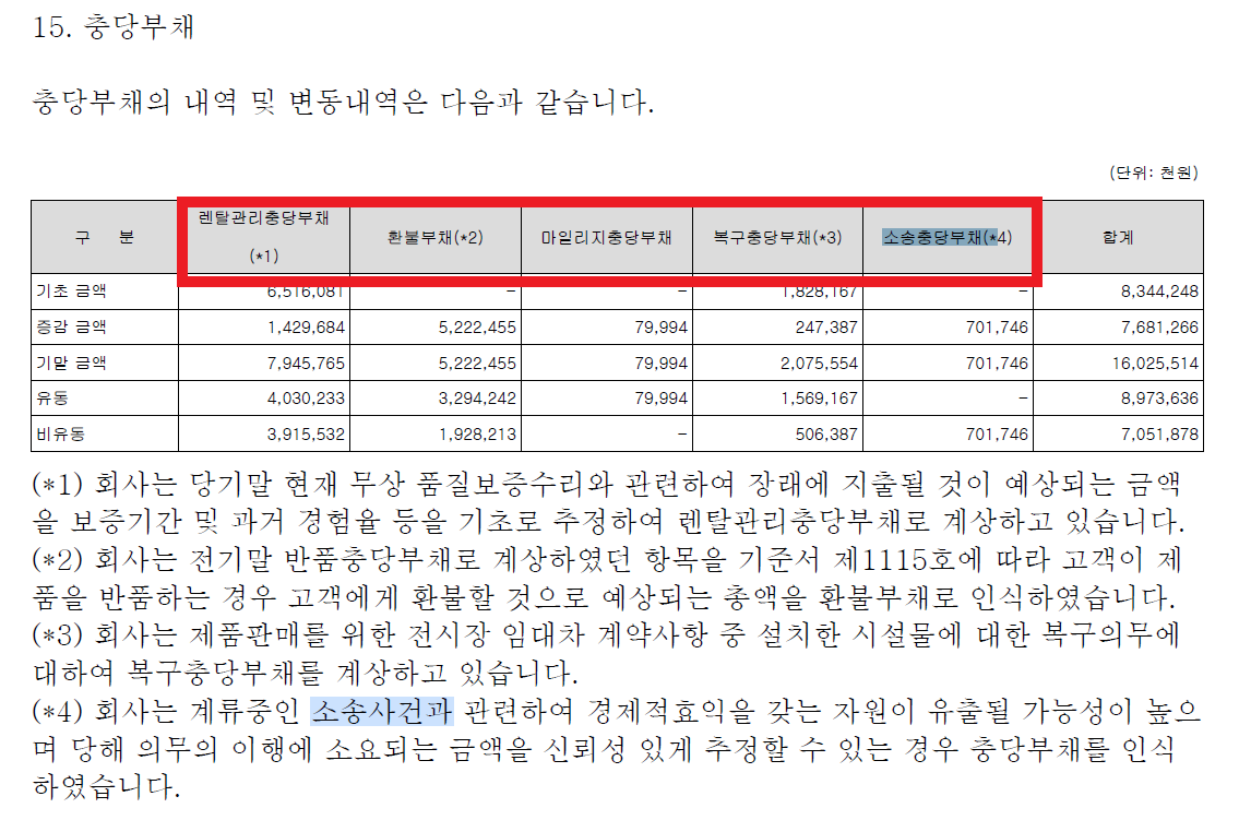 소송의 결과가 어느 정도 예측이 되면, 해당 금액을 충당부채라는 항목으로 재무제표에 표기합니다. 렌탈관리, 환불, 마일리지, 복구 등 상품과 서비스를 제공하다 보면 일정 비율이상 손실이 발생하고, 이를 미리 반영해 둡니다. 소송도 마찬가지로 ‘소송충당부채’를 통해 정리합니다.