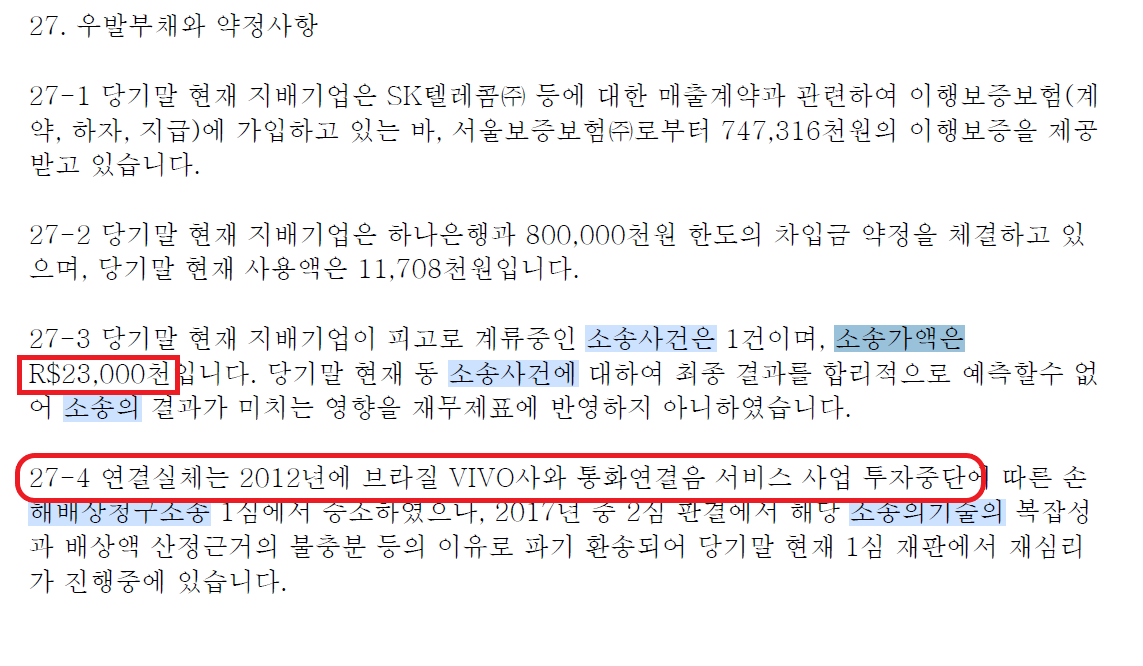 결론적으로 우발부채는 발생할 가능성이 높지 않은 손실입니다. 특히 '계류 중인 소송'이 대표적입니다. 어떤 회사를 살펴 볼 때, 재무제표를 읽는 이해관계자는 주석의 우발부채를 확인해야 합니다. 단지 우발부채로 발생하는 손실만을 체크하지 말고 비즈니스 속성을 파악하는 데도 도움이 되기 때문입니다. 부동산 경매할 때도 가압, 근저당은 꼭 확인해야 할 체크사항입니다. 재무제표 읽을 때도 우발채무(소송)이 어떤 것이 있는지 한 번쯤 검색해 보시길 바랍니다.