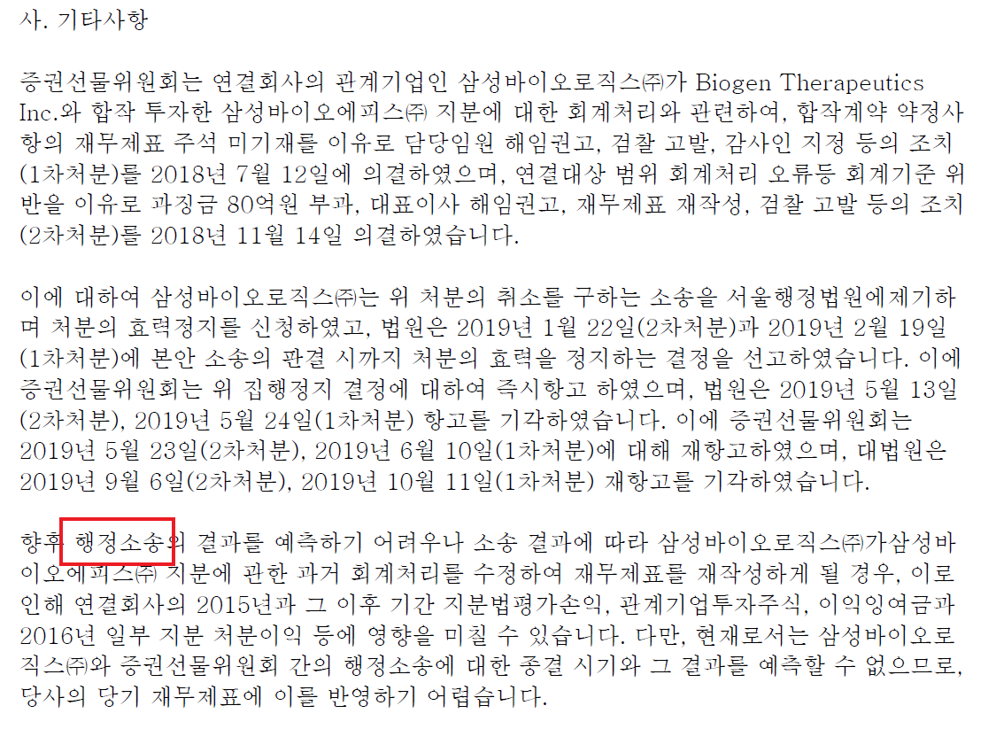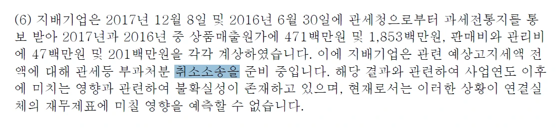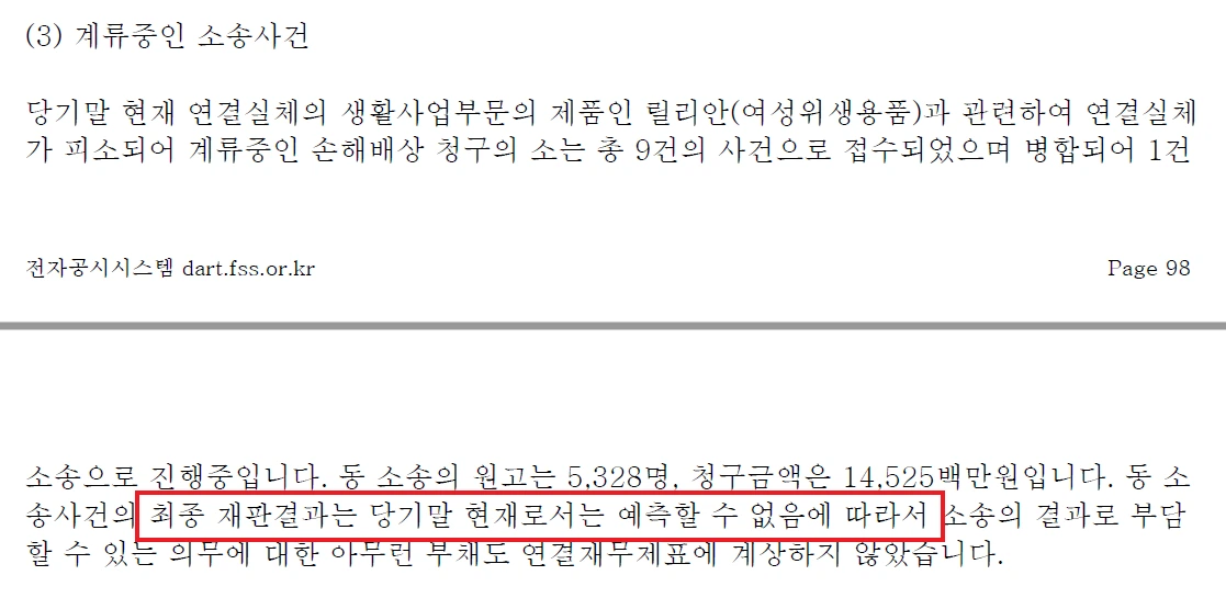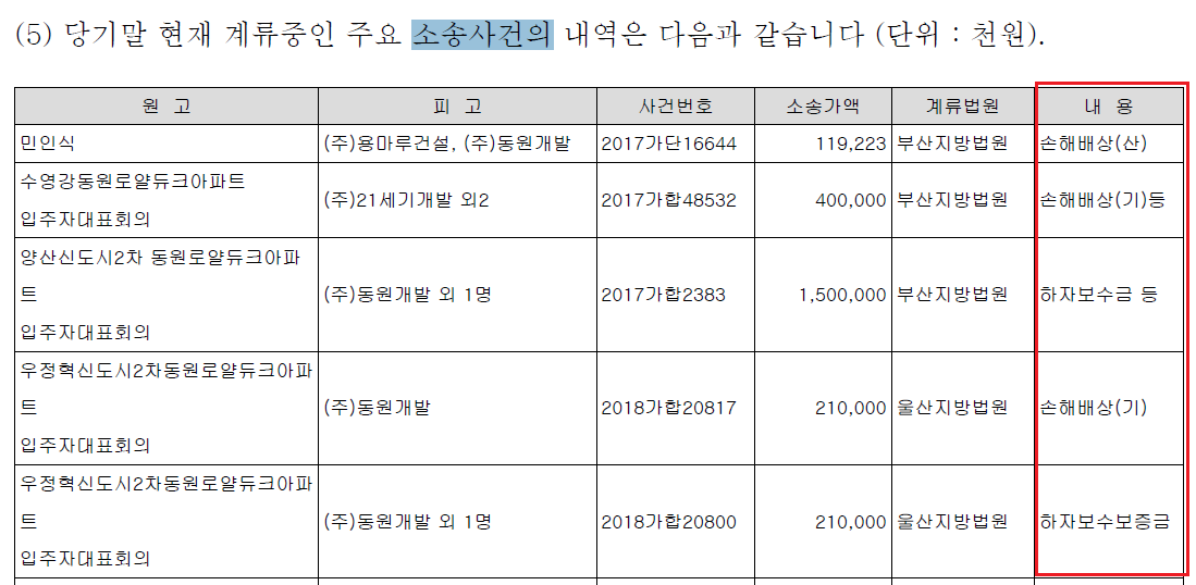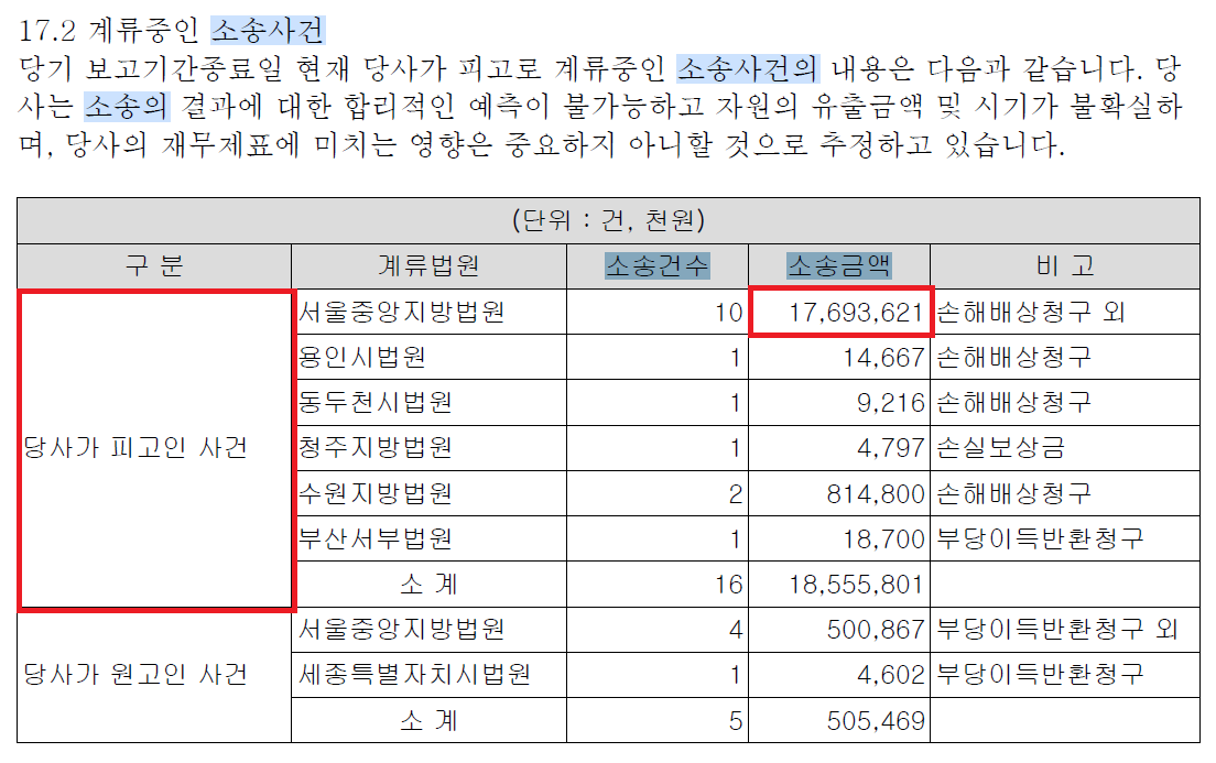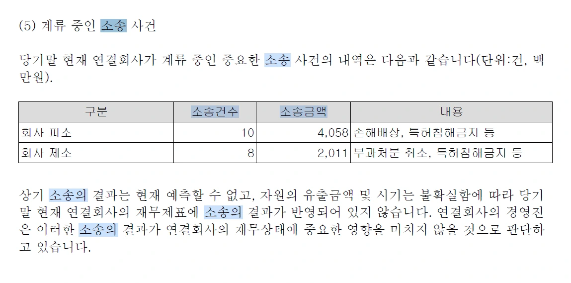 둘째는 내용입니다. 소송 관련해 기업이 진행했던 사업활동에 대해 기술되어 있습니다. 분쟁은 원인이 있고, 양측의 입장이 반대의 경우에 발생합니다. 무슨 일이 있었는지는 자세히 알 순 없으나 기업경영활동의 어두운 면(Risk)를 엿볼 수 있습니다. 특히 회사가 피고라면 더 주의 깊게 봅니다. 그럴 경우는 드물겠지만 경영활동이 진행되는 동안 발생한 분쟁이니 사업 자체에 문제점이 있는지 고려해 볼 사항입니다.