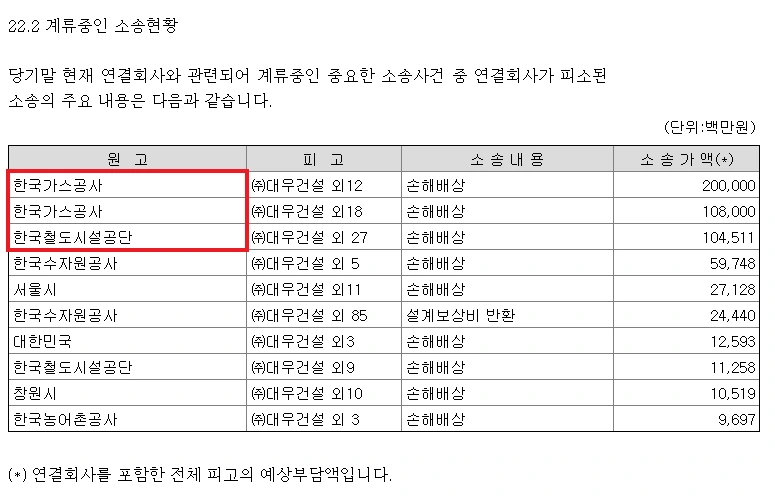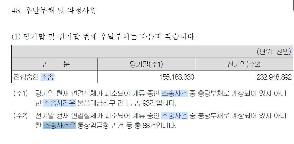 주석에만 표기하는 이런 우발부채 '계류 중인 소송사건'을 주의 깊게 봐야 할 부분이 있습니다. 첫째는 소송가액입니다. 만약 소송에서 패할 경우 소송가액은 회사의 실현해야 할 비용입니다. 상대방에게 물어 줘야 합니다. 이는 향후 손익계산서 상의 비용이며 당연히 이익에 악영향을 미칩니다. “소송 얼마나 되겠어?”라고 확인 안했는데 나중에 큰 금액이 나와 흑자가 적자로 바뀔 수도 있습니다. 왜냐하면 기업 간의 이권에 대한 소송이기 때문에 수천억 원에 달하는 경우도 있습니다.