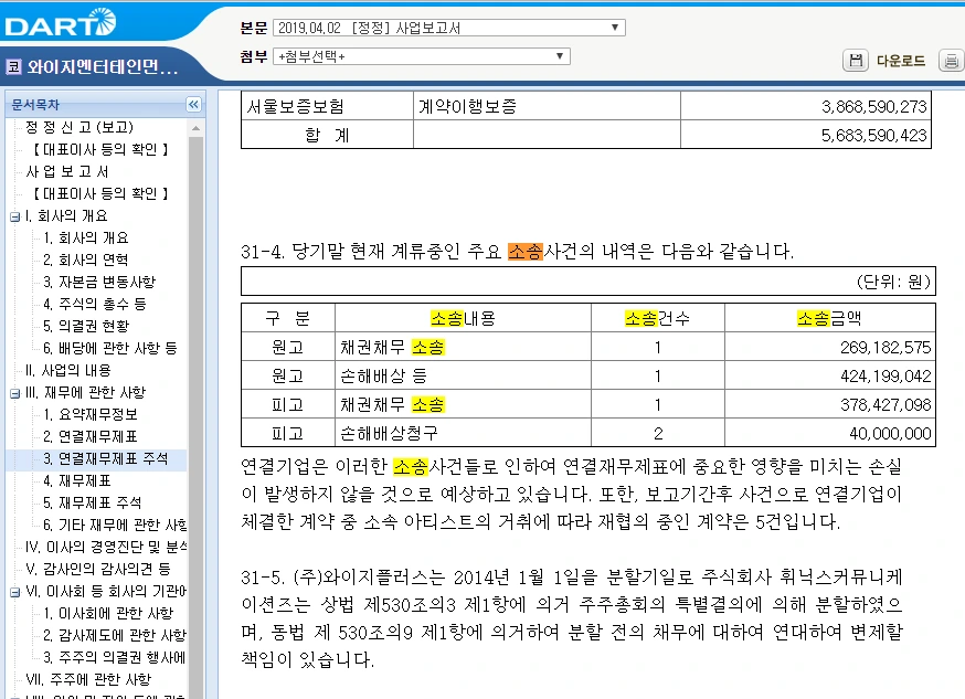 그 외에도 소송의 원인과 발생 대상은 다양합니다. 회사에 속했던 직원 관련 소송, 해외에서 발생한 사업, 채권채무, 특허권 침해, 판권 전속계약 등 실제 재무제표 상의 소송 표기 내용을 살펴 보겠습니다.