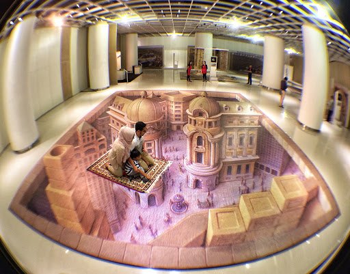회화에서의 일루전, 즉 환영에 대해 매우 간략하게 일축해 보겠습니다. 많은 분들이 알고 계시는 제욱시스와 파라시오스와의 그림 대결이 가장 대표적인 사실적 묘사에 따른 환영이라 할 수 있습니다. 우리는 신라시대 황룡사벽에 솔거가 그린 소나무 일화를 들 수 있겠네요. 이쯤 되면 느낌으로 아셨겠지요? 환영은 바로 종이라는 2차원의 평면에 3차원의 공간을 재현해내는 것을 말합니다. 르네상스 시대 미켈란젤로가 시스티나 성당에 그린 프레스코 벽화도 좋은 사례가 되겠습니다. 수많은 작가들은 평면에 건축적 입체감을 불어넣기 위해 고심했었습니다. 모더니즘 이후 회화는 평면 그 자체라는 점에 천착하게 되었고, 이후 작가의 표현 과정을 그대로 담은 액션 페인팅(Action Painting)이나 평면에 단일 색만을 칠하는 색면화(Color field Painting) 또는 캔버스의 사각형 그리드(grid)를 벗어나려는 노력 등 다양한 시도가 이루어졌습니다. 동시에 기존에 사실적인 재현을 넘어 의도적인 눈속임을 꾀하려는 회화도 꾸준히 자리 잡게 되었습니다.