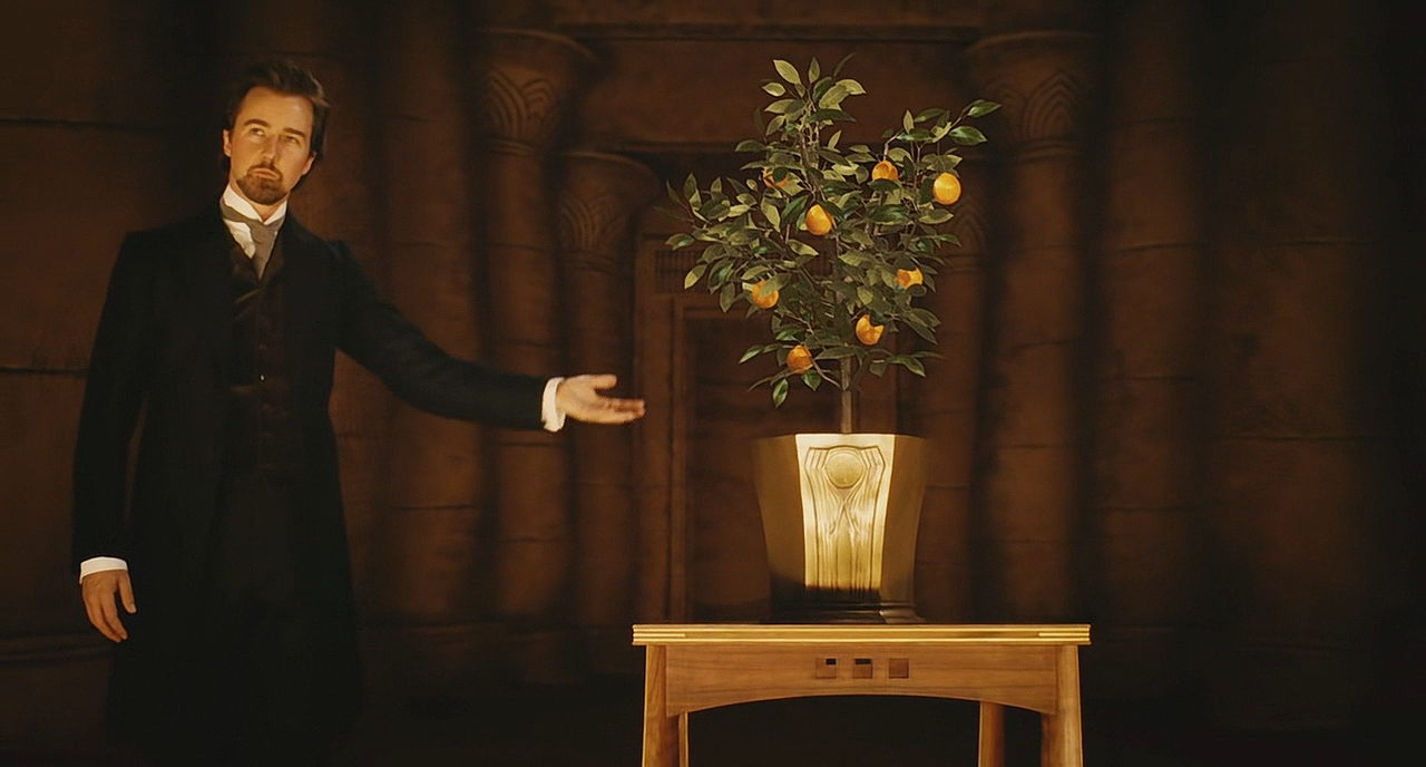 아이젠하임은 주관적인 시간의 느낌을 물체가 중력에 의해 떨어지는 속도를 조절하며 가시적으로 만들기도 합니다. 또한 오렌지에서 씨를 빼고 화분에 심어 물리적 시간을 특정 공간에서 빠르게 흐르도록 만들기도 합니다. 그가 “내가 풀지 못한 유일한 미스터리는 네가 없는데도 내 심장은 뛰고 있다는 거였어.”라고 말하는 장면은 제 심장마저 뛰게 합니다. 그런데 그가 볼 수 없는데도 마치 눈앞에 있는 듯 설렌다는 점이 아이젠하임이 유일하게 알아내지 못한 미스터리라는 점은 일루셔니스트가 얼마나 시각에 집중하고 있는지를 잘 보여줍니다.
