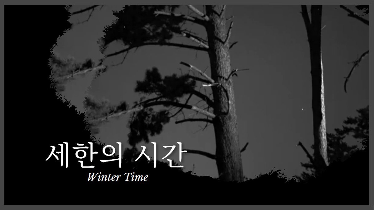 바람에 마른 가지가 떨리는 소리, 파도 위 센 바람이 일의는 물보라 소리, 산속에 퍼지는 외로운 발자국이 만드는 소리 등, 영상임에도 소리에 더 반응하게 되는 이 미디어 작품은 <세한의 시간>입니다.