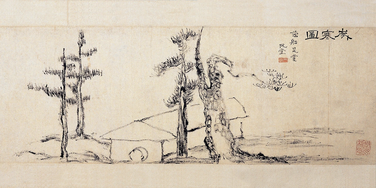 작품에서 주목해 볼 것은 중앙의 두 그루의 소나무인 듯합니다. 소나무는 추운 겨울에도 그 녹음을 잃지 않기에 예로부터 씩씩한 기상과 곧은 절개를 상징하는 것으로 잘 알려져 있습니다. 두 그루의 소나무를 그린 회화를 ‘쌍송도’라 일컫는데요. 김정희가 그린 두 그루의 소나무 역시 서로 의지하는 형태로 당시 동아시아에서 일반적으로 유행하던 <쌍송도> 형식을 따르고 있습니다. 서로를 향한 그리움, 상대방의 덕을 칭송하기 위함과 존경하는 마음을 내포하고 있는 것이 바로 <쌍송도>입니다. 김정희는 인생의 겨울에 의지할 수 있던 이상적에 대한 마음과 자신의 변하지 않는 절개를 두 그루의 소나무로 표현한 것으로 보입니다. 즉, 그의 <세한도>는 함께하고자 하는 벗에 대한 그리움, 존경심과 더불어 강한 기개로 혹독한 겨울을 이겨내려는 의지가 담긴 작품인 것입니다.