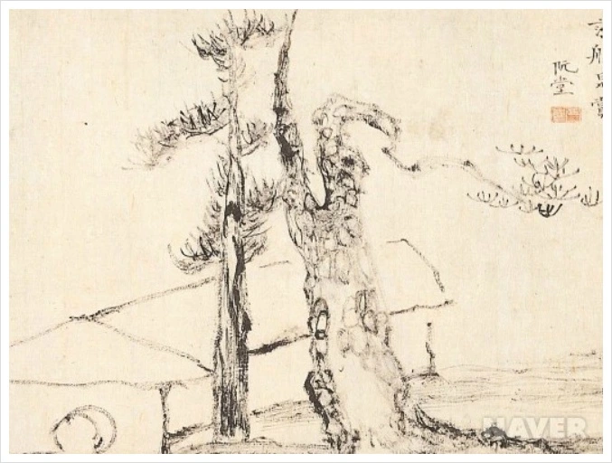 그려진 내용을 보면 배경이 없는 빈 공간에 집 한 채와 소나무가 보입니다. 이 작품은 어떠한 대상을 그대로 옮기는 재현에 의미를 두는 것이 아니라 마음의 내용을 그림으로 옮긴 것입니다. 즉, ‘그린 것’이라고 보지 않고, ‘쓴 것’이라고 설명하는 편이 더 적합할 것입니다. 때문에 매우 서예적이고, 전문화가 보다는 문인들 사이에서 성행하였습니다.