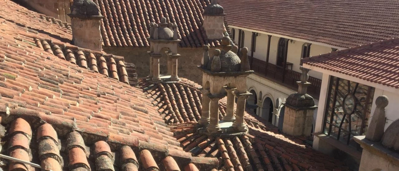 포도주를 만들고 저장했던 곳, 또 여러 가지 성물을 제작했던 방, 십자가에 못 박혀 있는 파란색의 예수님 등을 보고 성당 지붕으로 올라갔다. 여러 개의 돔이 있고 십자가도 세워져있는 붉은 지붕이 내부만큼이나 미적이다. 그런데 벽돌 모습을 자세히 보면 생김이 조금씩 차이가 있다고 앙헬리가 알려줬다. 벽돌을 만들 때 인부들이 자기의 허벅지를 벽돌틀로 사용했기 때문이라는 것이다. 이름으로 새겨진 듯 인부들의 작품에 세월의 꽃인 이끼가 피어 아름답기도 했다. 조심조심 지붕을 지나 종탑 앞에 앉아 멀리, 가까이 바라보니 장관이다. 설산이 보이고 라파즈 시내가 펼쳐져 있으며 바로 아래 광장에서는 많은 사람들이 모여 금요일 오후를 즐기고 있다. 다양한 물건을 파는 사람들, 춤도 추고 노래도 부르고, 퍼포먼스도 하는 길거리 공연도 펼쳐지고 있다.