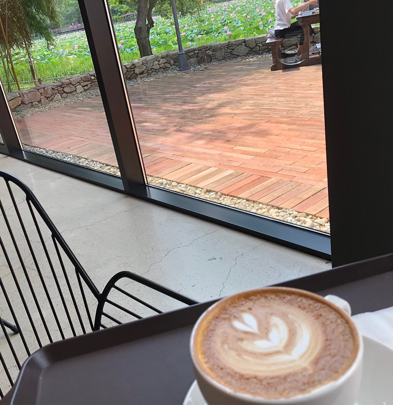강주연못 주위에는 카페가 몇 군데 있다. 그 중 연꽃에서 제일 가까이 있는, 벼락 맞은 나무 바로 앞 카페 로터스에 들어갔다. 커피 한 잔으로 덜 깬 내 몸의 세포들을 깨우고 들뜬 마음으로 연꽃을 구경했다.