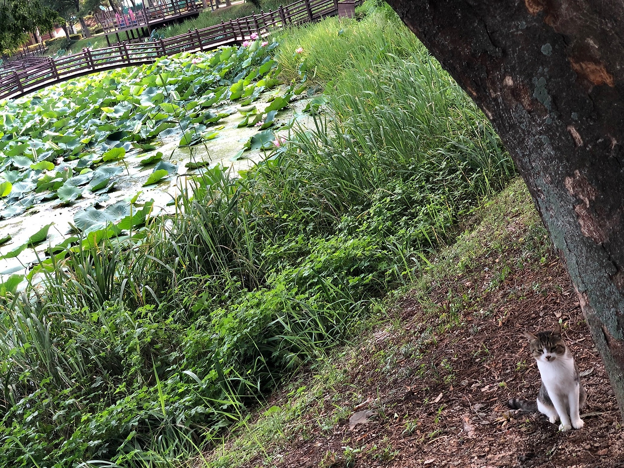 연못에는 연꽃만 있은 것이 아니다. 이름도 신기한 생아가리, 사마귀풀, 물달개비 등의 수생식물과 여러 종류의 새와 곤충들도 산다. 나는 잘 생긴 고양이를 만나 인사도 나눴다.