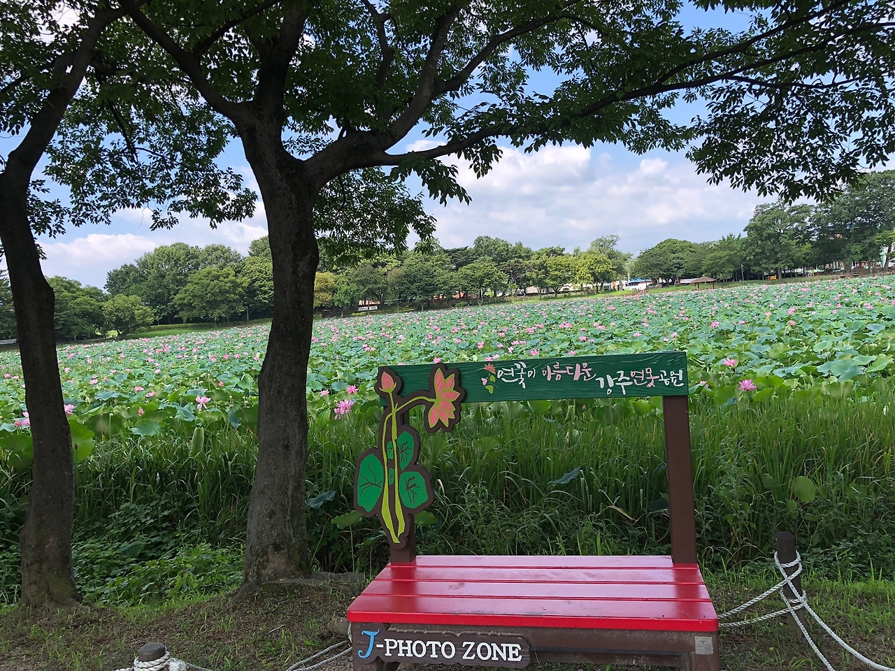 강주연못은 역사적으로도 중요한 곳이라고 한다. ‘진주’는 신라시대부터 고려시대까지 ‘강주’였는데 고려시대 강주에 군사를 주둔시켰다. 이 강주진영터가 조선시대에 연꽃밭으로 변했고 2004년 생태자연공원으로 조성되면서 데크, 정자 ‘강연정(康蓮亭), 벤치 등이 마련된 지금의 모습이 됐다.